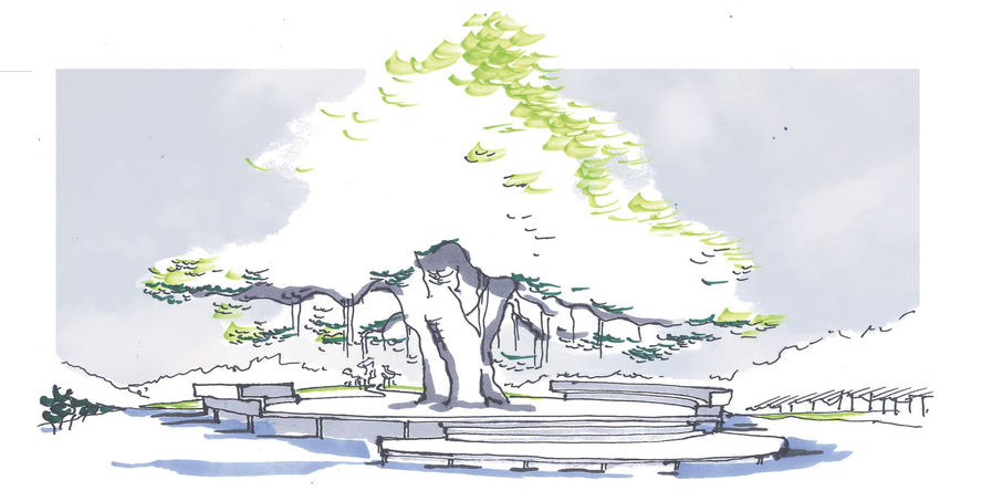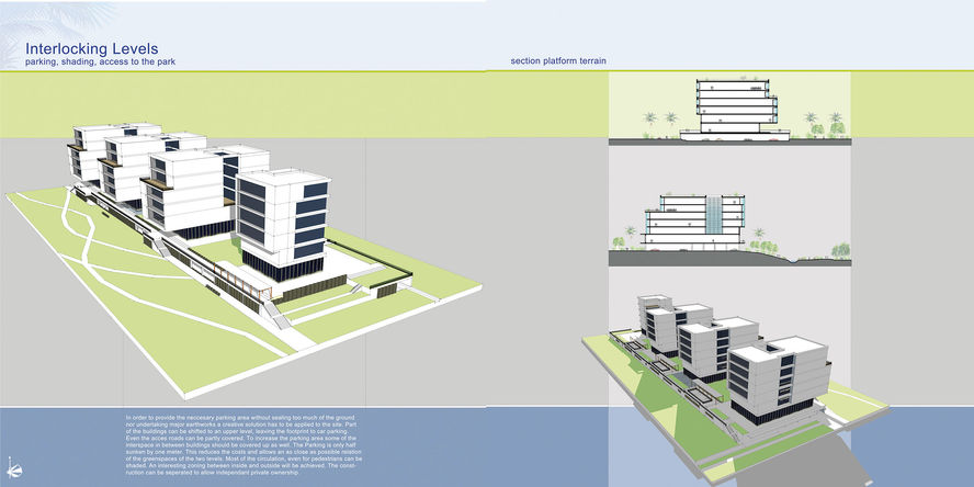 Close the Haikou, the capital city of the South Chineses tropical Island of Hainan, a large urban extension for business settlement is in the making. On one lot of land, a business park for start-ups and developers will be enlarged from a already existing park in the north the land. Small buildings are arranged to form large groups that can be connected into one unit if business requires. The construction can be phased according to the clusters of buildings. The layout draws advantage from the topography in place and turns the valley with the little creek into a park that integrates all areas of the compound. The central axis features a congress center, information pavilions and commercial space. It continues the portal of a school on an adjacent piece of land. The layout was developed together with Qiao Song at CCDI.