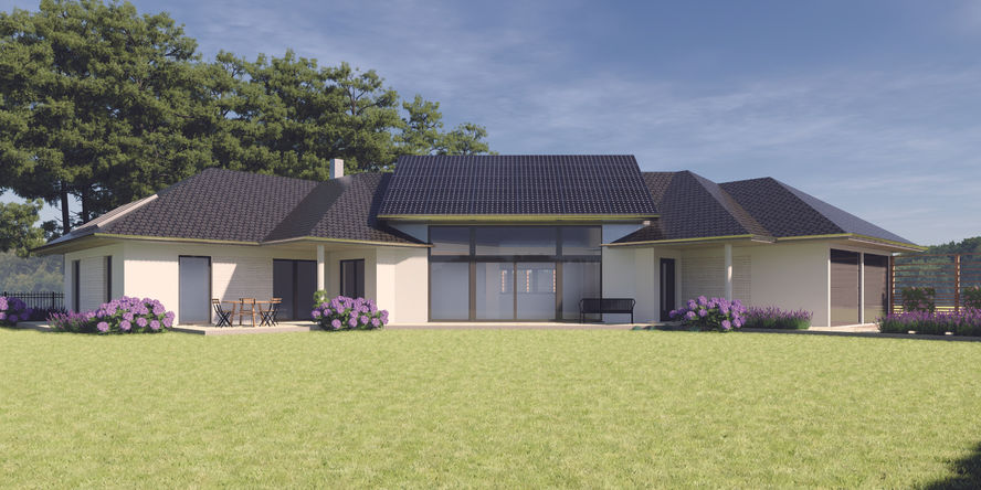 Dieser Entwurf entwickelt einen bestehenden Bungalowbau unter Einbeziehung einer Doppelgarage zu einer repräsentativen Villa weiter. Durch einen diagonal gesetzten Zwischenbau werden beide Teile verbunden und erhalten ein neues Zentrum. Während die neuen Aufenthaltsräume im Mittelteil angeordnet werden, wandelt sich das Ursprungsgebäude zum Privatteil der Anlage. Der höher gesetzte Zentralteil ist süd-ausgerichtet und bietet mit seiner die alten Dächer teils überragenden Dachfläche extra viel Platz für Solarpaneele. Der zuvor ungünstig auf der Rückseite des Hauses befindliche Hauseingang ist durch die Umordnung zur Front verlegt und zwischen Küche, Lager und Garage darüber hinaus eine Verbindung geschaffen. Das Gesamtbild des neu entstehenden Ensembles bewegt sich im Duktus der “Präriehäuser” des amerikanischen Architekten F. L. Wright.