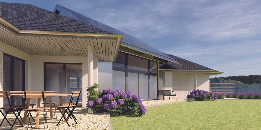 This design develops an existing bungalow by incorporation the garage into a representative Villa. The new, diagonally placed pavilion, links the two parts and establishes a new center. There the living area are arranged while old space houses exclusively the private quarters. The south oriented central roof surmounts and projects above the lateral wings, creating a large surface for solar panels. The former inconvenient backdoor entrance moves to front and a connection between the new kitchen, storage and garages facilitates housekeeping. The over all image leans towards the American Architect F. L. Wright's “Prairie House” characteristics.