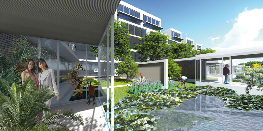 The residential project, designed for the developer CEG, on Baoqing Street in Yancheng combines two urban pattern. The flatland of Jiangsu province are veined with straight channels, along which narrow lots of land with one farm each row up. The front line of houses on the development continues the traditional patter of house clusters along the channels. Behind them high rises buildings follow an open pattern. The outer buildings are connected on two skirt levels and shield the interior garden against the streets. The central garden orients towards a stage, located between the two high buildings in the north. The combination of trendsetting architecture with a lifestyle marked by Music, Arts and Sports are integral part of CEG's philosophy. The project features a running track and an indoor 25m pool.