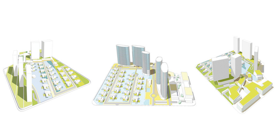 At the coast of Fuzhou in Fujian, a city extension is in the making. For one lot of land three different master plans have been developed. Their program is identical: Apartment buildings, hotel, free standing villas and a commercial retail zone. The buildings with residential and hospitality use shall have the view onto the bay but also comply with the south orientation, preferred in China. The three drafts represent alternatives, that give different priority to the conflicting orientation of the waterline and the south orientation.
